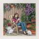 Uma bela ilustração do ai feita em um estilo de desenho animado de uma senhora bebendo café no seu pátio fora com seus dois gatos brancos. Ela está rodeada por belas cercas de Clematis roxa e outras plantas bonito.