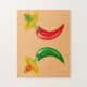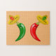 Este incrível quebra-cabeça de quebra-cabeça apresenta um par de chilis, um chili vermelho e um chili verde. Ambos têm olhos pretos e bocas cor-de-rosa. Cada Chili está vestindo um chapéu sombrio que tem um crânio de cor oposta ao dos chili em comemoração ao Dia Mexicano do Festival dos Mortos, Dia De Los Muertos. O sombrero também contém três flores com pétalas vermelhas e verdes alternadas representando a bandeira do México.