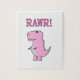 Um desenho animado e bonito t-rex. Quebra-cabeça de serra personalizadas. Design de desenho original. Rawr!
