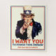 Acrescente seu próprio texto, poster do Tio Sam "Eu quero você", baseado na poster de 1917 de J. M. Flagg, que foi baseado em um poster original do Lord Kitchener britânico de três anos antes. Foi usado para recrutar soldados para a Primeira Guerra Mundial e para a Segunda Guerra Mundial. Flagg usou uma versão modificada do próprio rosto para o tio Sam. O botão ... Clique no botão "Personalizar" ou "Editar Design" para adicionar seu próprio texto, cor, fonte ou tamanho e criar seu próprio dom original especial (ou um tratamento especial para você mesmo!). Que tal o nome de alguém, uma saudação de aniversário ou de Natal, um lugar e um encontro?... ou, se quiser, não adicione texto e tenha a imagem por si só. NÃO SE ESQUEÇA DE ESCOLHER O NÚMERO CORRETO DE PEDAÇOS DE JIGSAW! Ajuste sua foto e texto conforme necessário. Piece & Quiet© - Todos Os Direitos Reservados.