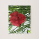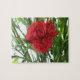 Esta quebra-cabeça espetacular mostra uma fotografia detalhada de uma incrível flor vermelha de cravos. A fotografia foi tirada usando macro fotografia para mostrar a beleza desse brilhante florescimento vermelho cercado por uma folhagem verde.