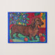 Estes trabalhos de arte de um dachshund são uma pintura acrílica por Lori DeLeonardis-Aman. Fazem um quebra-cabeça bonito para amantes do cão de todas as idades.