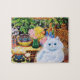 Quebra-cabeça colorido que caracteriza um gato branco que lounging em um jardim. Este puzzler é feito de uma imagem de Louis Wain; sua arte do 1800's atrasado é conhecida para os seus animais antropomórficos, gatos e jardins especialmente coloridos.