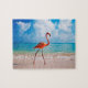 Este quebra-cabeça do jogo é mostrado com um impressão da foto do pássaro do flamingo na praia.