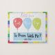 Procurando uma maneira criativa de convidar a alguém ao baile de formatura? Porque não os criar um quebra-cabeça promposal feito sob encomenda. Adicione o nome da pessoa que você está convidando ao baile de formatura. Assine seu nome na parte inferior. A beira colorida acentua três balões do baile de formatura. Personalize isto promposal com o nome de sua data do baile de formatura. Quebra-cabeça promposal bonito e especial para alguém especial a resolver. Faz uma lembrança agradável demasiado!