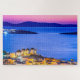 Quebra-cabeça do por do sol de Mykonos. Ilha famosa de Cyclades na piscina.