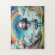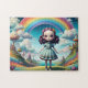 'Sonhos Arco-Íris' Este quebra-cabeça de serra é uma cena química de uma menina numa paisagem temática arco-íris.