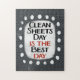 "O Dia das Folhas Limpas é o Melhor Dia" é um design de texto bonito em cinzas com texto preto e vermelho. As palavras sentam-se em forma de sotaque branco cercado por pontos brancos bonitos.
