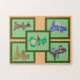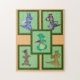 Bonecas de dragão colocadas sobre fundos verdes pálidos, armações verdes dentro escuras e coloridas. Cinco Dolls diferentes (cores azul, verde, amarelo, listrado e canavial doce). Uma imagem fica em cada canto com a quinta imagem colocada sobre ela no centro. Os quadros são definidos em plano de fundo bronzeado.