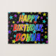 Este design de quebra-cabeça de campo divertido e animado, com tema de aniversário, mostra a mensagem "HAPPY BIRTHDAY, DONNA" com os personagens que têm um espectro colorido de arco-íris inspirado num padrão de gradação, junto com um padrão de fundo de campo estelar excitante. Uma quebra-cabeça colorida como esta pode ser uma maneira divertida de enviar cartões de aniversários a alguém chamado Donna. [~Z0000468]