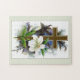 borda de ouro com bordas brancas com uma grande flor branca, botões de flores e folhas verdes à frente, com fundo em blues e roxas. Linda serena vintage arte cristã em dourados, verdes e brancos.