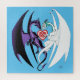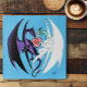 Um dragão roxo e branco no ar formando um coração com suas asas e um rosa celta um coração vermelho entre eles em um fundo de azul.
