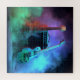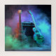 Two vibrant electric guitars - one in earthy tones, another in emerald blue - rest elegantly alongside an amplifier, creating an immersive musical atmosphere. The contrast between the instruments and the dark surroundings evokes passion and creativity, perfect for music lovers seeking visual inspiration.