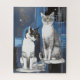 Quebra-cabeça em uma ilustração de dois gatos sentam-se graciosamente contra um fundo azul profundo, abstrato. As texturas realistas de pelo com ousada linhagem e elementos geométricos criam uma atmosfera moderna e surreal. Seus olhos amarelos expressivos contrastam impressionantemente com os arredores legal.