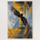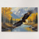 A majestic bald eagle soars over a wilderness river, as aspens turn yellow on the banks. Rocky mountain peaks have light covers of snow in the background. Perfect for anyone who loves nature, wildlife, and the outdoors.