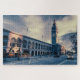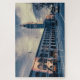 A imagem mostra o Prédio Ferry de São Francisco com sua icônica torre de relógio, capturada em nível de rua. A fachada do edifício apresenta janelas arquivadas e uma estrutura longa e horizontal. Várias bandeiras são visíveis no alto do prédio. Uma rua corre em frente ao prédio, com carros dirigindo sobre ele. O céu está nublado, e a paleta de cores é muda, com blues e cinzentos dominando a cena.