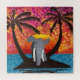 Elefante em pequena ilha entre palmeiras. A paisagem é criada por pontos pintados. Água azul e céu por sol, com ilha e árvores na silhueta. O elefante de brinquedo crochado é colocado entre as duas palmeiras.