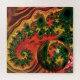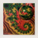 Um design fractal vibrante e complexo apresenta padrões giratórios e uma esfera flutuante com um padrão intrincado semelhante. As cores são predominantemente laranja e vermelha, com acentos de verde nas formações fractais, dando à composição uma sensação energética e dinâmica.