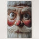 Um close muito detalhado de uma figurina de Papai Noel com olhos largos e expressivos, bochechas rosadas e um nariz vermelho brilhante. Os detalhes texturizados da barba e da pele criam uma representação semelhante à vida e caprichosa, capturando um momento de maravilha ou surpresa.