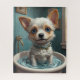 Animais de estimação adoráveis sentados numa banheira, com gotículas de água e bolhas à sua volta. O filhote olha para o espectador com olhos largos e inocentes, e suas pequenas patas estão na borda da banheira. A atmosfera é bonitinha e humorística, fazer ideal para um conjunto de poster.