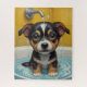 Animais de estimação adoráveis sentados numa banheira, com gotículas de água e bolhas à sua volta. O filhote olha para o espectador com olhos largos e inocentes, e suas pequenas patas estão na borda da banheira. A atmosfera é bonitinha e humorística, fazer ideal para um conjunto de poster.