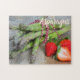 Espargos verdes com morango em souvenir de fundo de madeira ou presente para chefs vegetarianos e amante de comidas vegetarianas.
