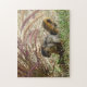 O esquilo está descansando sob um grupo de capim "Chuva Roxa". As frentes de grama se espalham pelo animal como sombra.