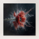 A imagem mostra um papoila vermelho solteiro no cheio florado, definido em um fundo preto estrelado. A flor é o foco central, com suas delicadas pétalas espalhadas e seu centro escuro sobre cheio. O aspecto mais impressionante da imagem é a água que se espalha ao redor da papoila. Parece que a flor está no coração de uma explosão, com gotas de água congeladas no ar do médio, criando um efeito dinâmico e quase eéreo. O contraste entre o vermelho vibrante da papoila e o fundo escuro, junto com o foco nítido na flor e na água, faz uma fotografia cativante e artística.