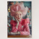 Um retrato espantoso de uma idosa elegante, com um estilo de cabelo rosado extravagante e um traje de convivência, exuberando confiança e charme. Sua composição vibrante e seus acessórios detalhados, incluindo broches em forma de coração, evocam temas de amor e paixão. Com um sutil festeiro de seus lábios, ela parece soprar um beijo delicado, adicionando um toque de romance ao confortável fundo do café.