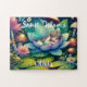 Quebra-cabeça de fada personalizada. Uma fada bonita dormindo em uma flor de lótus em uma almofada de lírio com flores e fundo de cogumelo. Uma ilustração do estilo de conto de fadas. Bons sonhos.