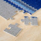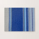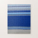 Padrão de crochê em listras de branco e tons de azul. O azul escuro é predominante. Feche a fotografia.