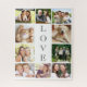 Um quebra-cabeça de colagem de fotos perfeito para as noites de jogos da família. Você pode personalizar com dez fotos da família. "AMOR" está escrito verticalmente no meio.