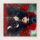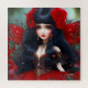 Retrato de uma Princesa Fada Vermelha Cuta em vestido preto e de ouro e belas asas vermelhas cercadas de flores vermelhas. Arte original de Gifts_AtTheCorner Mjm ©2023.