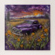 Um belo veículo retro roxo estacionado em um campo de flores silvestres de montanha, arte gerada por IA