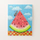 Este quebra-cabeça de um quebra-cabeça de arte de verão ilustra uma deliciosa fatia de melancia com um inseto giro escalando seu lado em um pano de mesa com céu azul atrás. Excelente para as crianças e para aqueles que adoram a arte química.