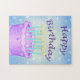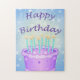 Feliz aniversario com bolo roxo, velas azuis e estrelas