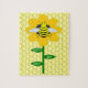 Este quebra-cabeça espetacular apresenta uma imagem gráfica de um belo abelhão amarelo com listras, olhos, antenas e pernas pretas. Tem asas bonito, azuis e brancas. A abelha está sentada no meio de um girassol amarelo-ouro. A flor tem um caule verde e três folhas. A mensagem "dia feliz das abelhas" aparece espalhada pelas três folhas. O fundo é composto por um padrão amarelo de mel.