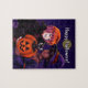 Estas duas crianças estão prontas para fazer truques ou tratar. Até o gato preto está vestido com o espírito do Halloween!