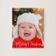 Elegante quebra-cabeça de fotos de Feliz Natal com um belo roteiro cursivo em branco. Este presente de fotografia de bebê de Natal moderno apresenta uma magnífica tipografia e o seu texto personalizado sobre a imagem de sangria de cheio em branco no topo. Perfeito para celebrar um bebê sorridente ou uma criança feliz.