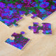 Um rosto feliz de uma flor de dandelion amarela em um leito azul roxo brilhante e colorido de uma flor rosa num primavera dia, um rosto beaming te dá um sorriso e te anima. Esta fotografia floral hippy num quebra-cabeça é uma ideia de presente com um sorriso enorme, fotografada por Katho Menden.