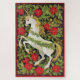Pintura do Unicórnio de Natal com flores de poinsettia vermelha e folhas verdes sobre fundo escuro.