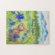 Um coelhinho feliz sai dos arbustos. Ele está aproveitando a primavera da Iris e das flores. As belas Montanhas Cascata piscam no fundo.