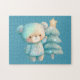 Um quebra-cabeça com uma ilustração adorável. Um urso aconchegante com estrelas e faíscas no pelo. Ao lado de uma árvore de Natal. Cor azul-esverdeada do Pastel. Whimsical e fofo.