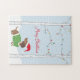 Uma bela quebra-cabeça de serra de Natal feliz para o inverno. Design apresenta luzes de Natal envoltas em árvores e um cão Dachshund vestindo um chapéu vermelho de Papai Noel na neve.