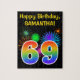 Este design de quebra-cabeça vibrante e divertido apresenta um padrão colorido inspirado em fogos de artifício celebratórios, juntamente com o número "69", que inclui um padrão de gradação inspirado no arco-íris multicolor, num fundo de cor preta. Ele também apresenta um nome personalizado e uma mensagem de evento, como uma saudação de aniversário. Um quebra-cabeça como este pode ser uma maneira divertida de enviar uma mensagem de saudação em comemoração do sexagésimo nono aniversário de alguém. [~Z0000329]