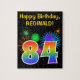 Este design de quebra-cabeça vibrante e divertido apresenta um padrão de inspiração colorida para fogos de artifício celebratórios, juntamente com o número "84" com um padrão de gradação inspirado no arco-íris multicolorido, num fundo de cor preta. Ele também apresenta um nome personalizado e uma mensagem de evento, como uma saudação de aniversário. Um quebra-cabeça como este pode ser uma maneira divertida de enviar uma mensagem de aniversário para celebrar o oitenta e quarto aniversário de alguém. [~Z0000329]