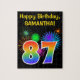 Este design de quebra-cabeça vibrante e divertido apresenta um padrão colorido inspirado em fogos de artifício celebratórios, juntamente com o número "87", que inclui um padrão de gradação inspirado no arco-íris multicolor, num fundo de cor preta. Ele também apresenta um nome personalizado e uma mensagem de evento, como uma saudação de aniversário. Um quebra-cabeça como este pode ser uma maneira divertida de enviar uma mensagem de aniversário para reconhecer o oitenta e sétimo aniversário de alguém. [~Z0000329]