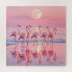 Os flamingos cor-de-rosa ficam graciosamente ao longo de uma praia refletida na água tranquila à medida que uma lua de tinta cheio sobe no céu pastel