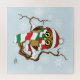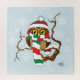 Coruja redonda giro-branca em vermelho e verde. Flocos de neve caindo ao seu redor