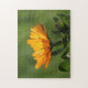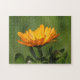 A flor do calendário laranja está se abrindo para o céu. A floração do solteiro é colocada sobre um fundo verde difuso de folhas.